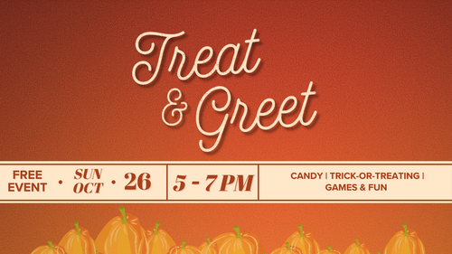 Fall is back! We're planning to celebrate in style! Join us for our "Treat & Greet" October event! All are invited to this free, community-wide event. Invite your friends and neighbors to join us for a night of trick-or-treating, games, and candy...lots of candy! Hot dogs and other refreshments will be served as well. Click the button below for more info and to register!